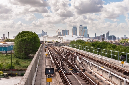 The railway tracks of Docklands Light Railway with Canary Wharf skyscrapers in the background