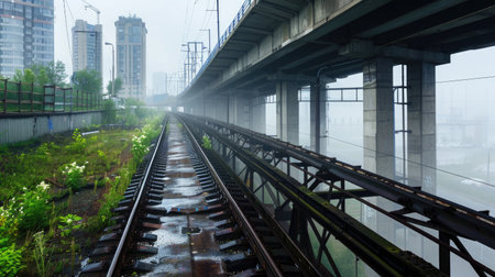 A captivating view of abandoned railway tracks disappearing into a foggy urban landscape, showcasing modern buildings alongside lush greenery and atmospheric weather.