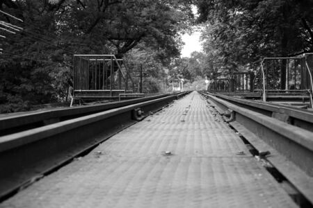 Low angle shot railway track with RAILWAY STEEL FOOT OVER BRIDGE, shallow depth of field, Metal railway track in india, train tracks, metal track for train in india, travel and transportation concept.