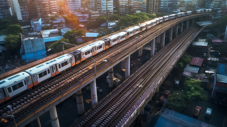 An AI generated illustration of an aerial view of a train moving through an urban landscape