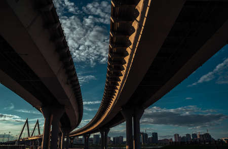 Highway overpass in Kazan, Russia, under view of the concrete pillars. The concept of urbanization.