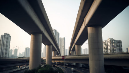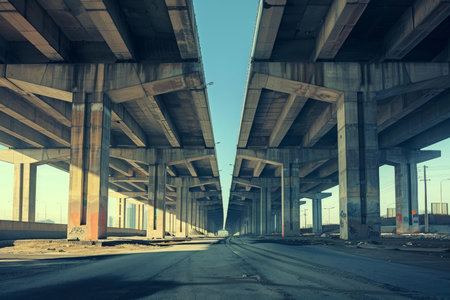 Captivating view of concrete pillars supporting a highway overpass, showcasing an architectural marvel against a bright sky in an urban setting.