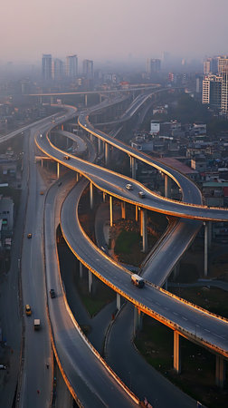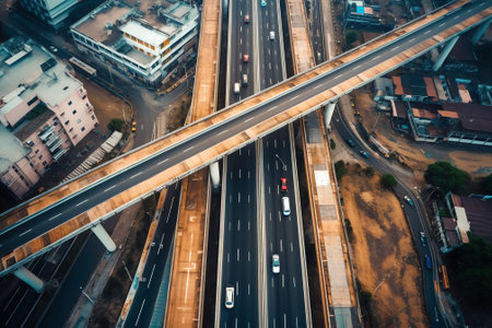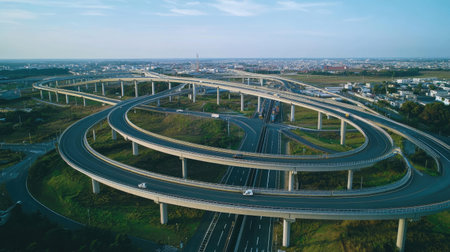 An overhead view reveals a complex highway interchange with multiple lanes and elevated roadways. The scene presents a network of curved concrete structures with vehicles traveling in various directions. The composition suggests a metropolitan setting with a focus on transportation and infrastructure, suitable for editorial and commercial applications.