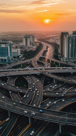 Captivating aerial view of a busy highway interchange at sunset, showcasing vehicles moving through dramatic urban landscape, capturing the essence of modern transport infrastructure.