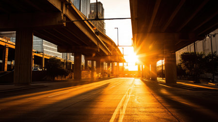 An overhead view reveals a multi-lane highway, flanked by elevated concrete structures. Sunlight illuminates the asphalt and the surrounding green environment. The composition emphasizes lines and perspective. Suitable for urban planning, infrastructure, and transportation projects, as well as editorial content.
