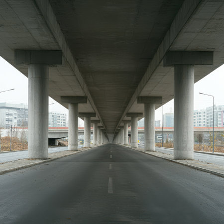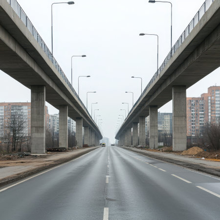 Urban Landscape Featuring Concrete Overpass Structure with Empty Road on a Gloomy Day in a Modern City Setting