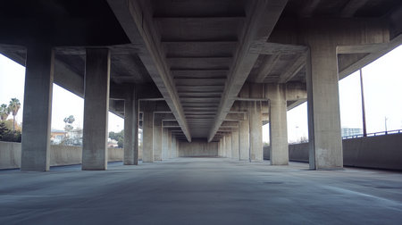 This image showcases an empty urban underpass, emphasizing the strength of concrete architecture with dramatic pillars and clean ground. Ideal for modern design and urban studies.