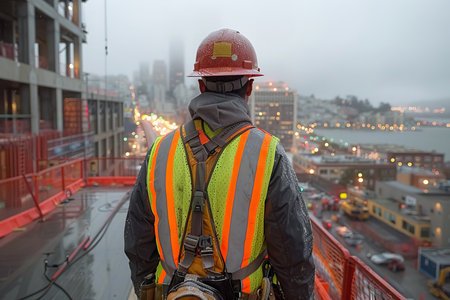 A construction worker stands on a high platform, wearing reflective gear and a hard hat. The city skyline is visible, illuminated by lights as rain falls, creating a moody atmosphere at dusk..