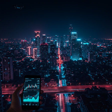 A person holds a smartphone showcasing stock market data against a glowing city backdrop. The scene captures the essence of financial analysis in an urban environment, highlighting the intersection of technology and investment.