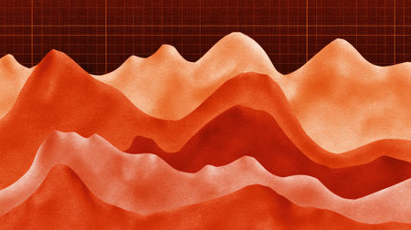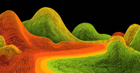 An abstract illustration presents layered ridges in hues of green, yellow, and orange, creating a sense of depth and dimension. The image utilizes textured lines to simulate a landscape, possibly representing geological formations. Suitable for various applications, this design may be used in commercial and editorial contexts.