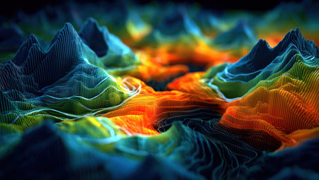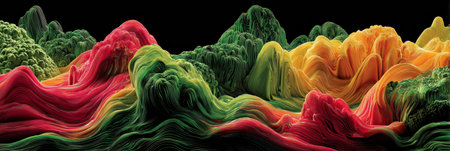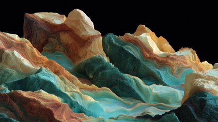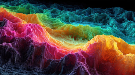 Abstract digital art of colorful layered hills and valleys against a black background