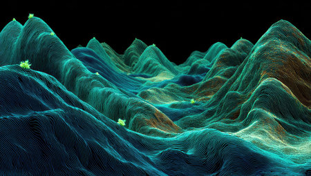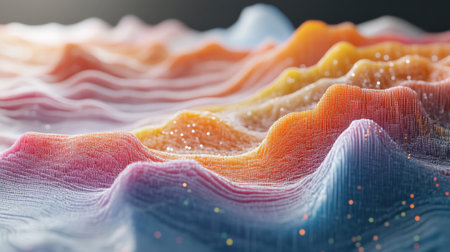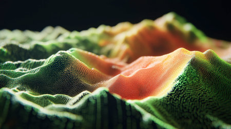 A detailed 3D topographic model displays various elevations and colors, possibly representing a landscape. The composition highlights gradients of orange, green, and blue. This artistic representation may be suitable for educational, scientific, or conceptual visual applications. It provides a detailed, informative, and visually appealing depiction.