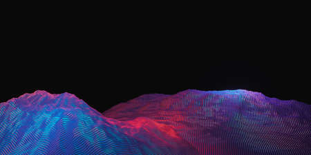 Wireframe abstract mountain landscape. Future technology, big data grid background in violet and blue color on black. 3D illustration