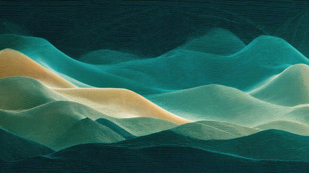 An abstract digital illustration showcases undulating layers of green and blue forms, resembling a stylized landscape. The artwork features textured surfaces and a dark background. This image could be suitable for various commercial uses, including website design or editorial content.