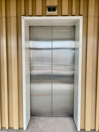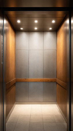 Vertical framing captures the interior of a contemporary elevator featuring wooden panels and metallic accents, creating a spacious and inviting ambiance with ample copy space for design