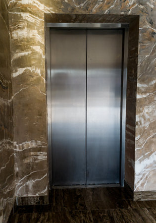 Modern elevator or lift doors made of metal closed in building with lighting