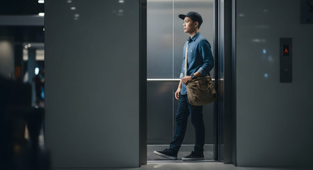 A young Asian man wearing a denim shirt and a cap stands inside a modern elevator with silver doors. He carries a messenger bag, depicting a daily commute, delivery, or urban lifestyle scenario.