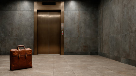 A brown leather briefcase is sitting in front of an elevator. The briefcase is open and the handle is visible. The elevator is empty and the room is dimly lit
