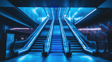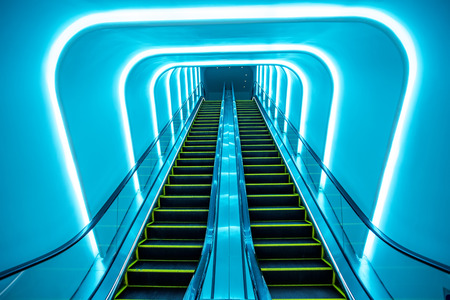 Escalator with blue LED side lighting ascending inside a minimalist commercial space