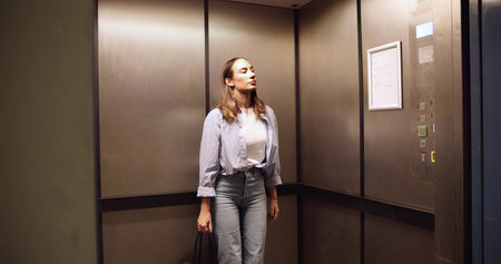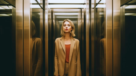 Businesswoman in elevator Full length of beautiful young businesswoman in formalwear pushing button while standing inside of elevator : Generative AI