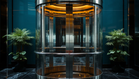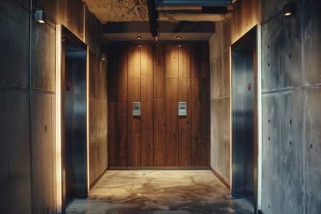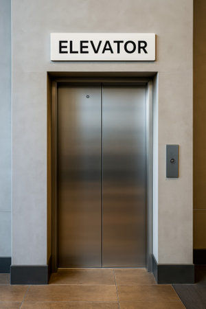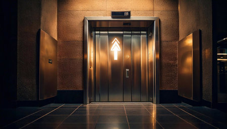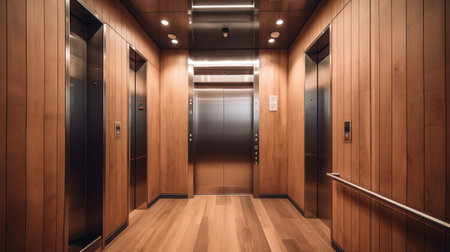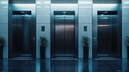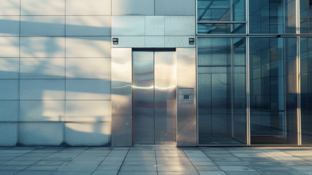 Stylish elevator doors in a luxury office building, showcasing elegant design, clean lines, and modern fixtures