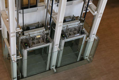 Open elevator lift shaft. Modern architecture with transparent ceiling. Shopping mall or business center. Maintenance repair and service