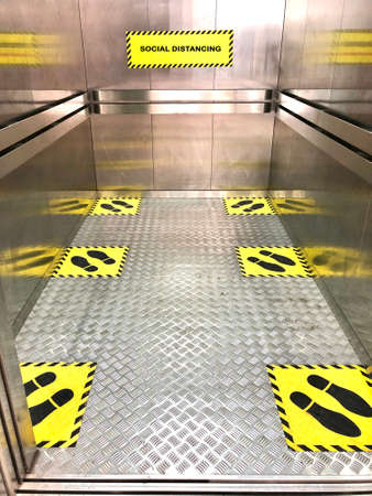 Social distancing for COVID-19 coronavirus crisis prevention with yellow footprint sign with text caution to respect social distance, in public elevator (lift) area