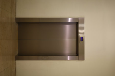 Closed elevator doors with sleek design inside a modern office, reflecting efficiency and convenience.