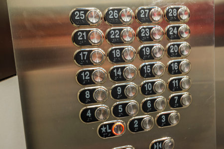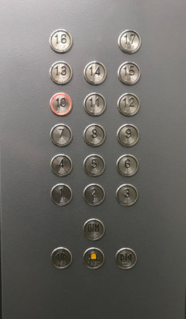 Interior and closeup of metal buttons in elevator. Level 5 is highlighted. Selective focus