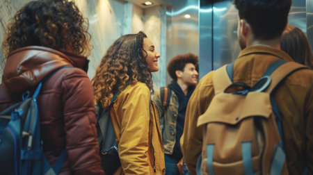 A group of friends backs to the camera chat and laugh as they wait for the elevator in the bustling lobby of a skyser. .
