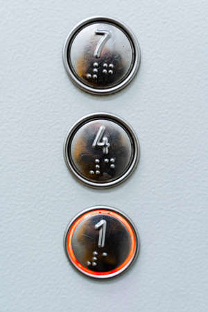 An approximate shot of three elevator buttons. Seven, four, one. Burning elevator call button. Font for the blind on the elevator panel. high quality photo
