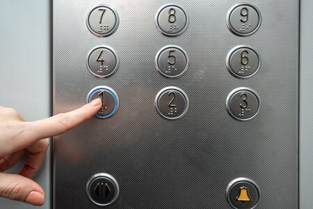 Female hand, finger presses the elevator button. up the career ladder