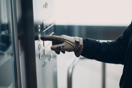 Close up of forefinger in glove pressing the button elevator during virus pandemic quarantine concept