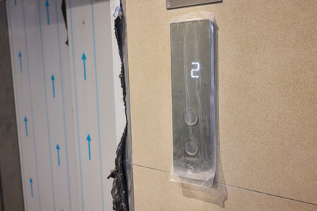 Modern elevator door with electronic control panel and light switch, closeup
