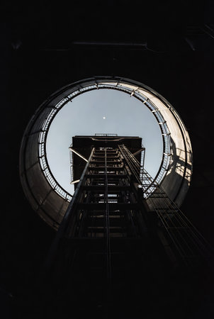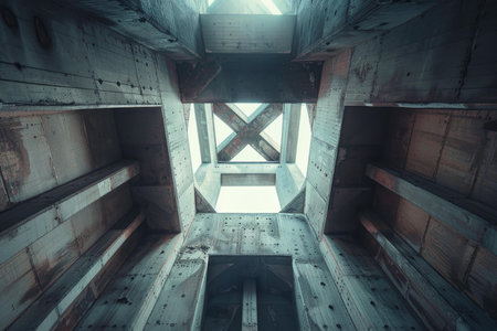 Low angle view of an elevator shaft with metal beams and cables, creating a powerful industrial scene