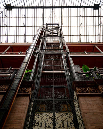 Open elevator lift shaft. Modern architecture with transparent ceiling. Shopping mall or business center. Maintenance repair and service