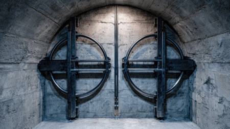 Detailed view of a strong industrial door featuring a bold metal design set against a dimly lit concrete backdrop, emphasizing strength and uniqueness.