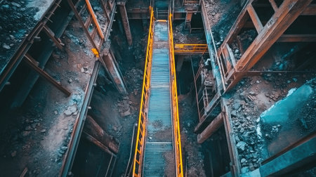 High-angle view of conveyor belt junction deep underground with steel frameworks and coal debris