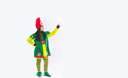 Merry Christmas! Little girl in Santa's elf costume on bright color background. Red and green.