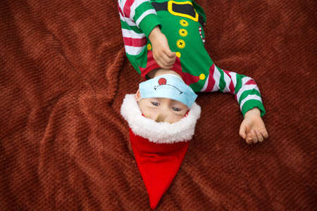 Cute little boy wearing elf costume sitting on a green fur carpet