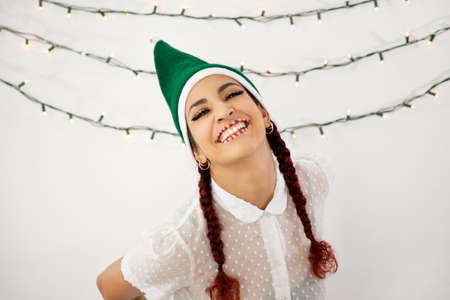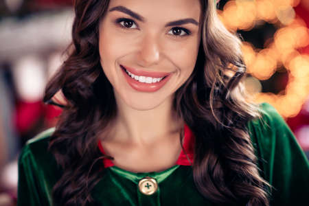 Photo of charming shiny young lady wear elf clothes celebrating christmas smiling indoors house home room