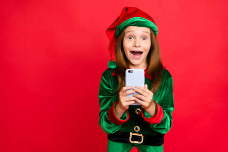 Portrait of shocked elf in green hat cap with long red head screaming wow omg use smartphone get like noel comment wearing elf costume isolated over red background