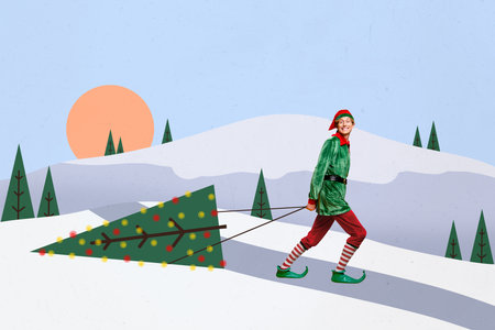 Creative composite collage artwork photo of good mood guy in elf costume bring christmas tree at home isolated on drawing background