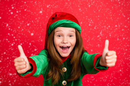 Close up photo of cheerful elf kid in hat cap having long red head showing her thumb up screaming recommend noel event wearing green costume isolated over red background