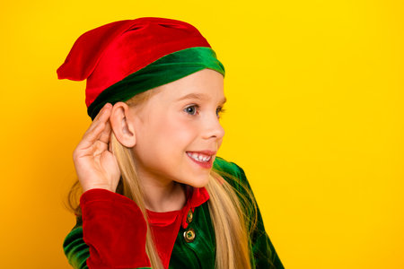 Happy little girl in elf costume on yellow backdrop celebrating the festive season with a cheerful smile