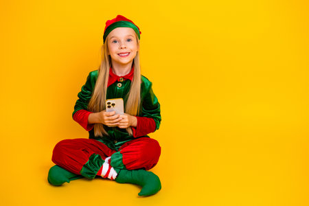 Joyful girl in festive elf costume with smartphone against vibrant yellow background celebrating Christmas spirit