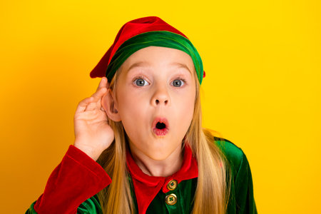 Excited child in festive elf attire making a wonder expression against a vibrant yellow background