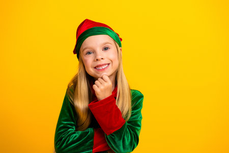 Joyful little girl dressed as an elf with a vibrant yellow background, spreading festive cheer during the holiday season