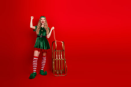 Joyful young woman dressed as a holiday elf with a vintage sled against a vibrant red background for a festive scene