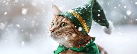 Adorable and Playful Cat Dressed up as an Elf with a Green Hat and Collar Isolated on a Snowy White Background for a Festive and Cozy Christmas Holiday Concept